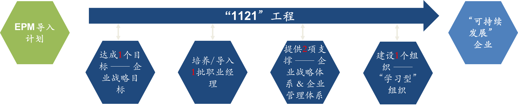 ? ? ? 企業(yè)EPM導(dǎo)入——“1121”工程:以達(dá)成“1”個(gè)目標(biāo)(即“企業(yè)戰(zhàn)略目標(biāo)”)為導(dǎo)向,通過(guò)向企業(yè)培養(yǎng)/導(dǎo)入“1”批職業(yè)經(jīng)理,提供“2”項(xiàng)支撐,創(chuàng)建“1”個(gè)組織,最終實(shí)現(xiàn)企業(yè)的長(zhǎng)期、可持續(xù)發(fā)展!