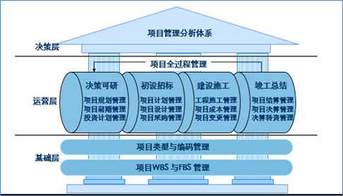? ? ? 1、基礎層:統(tǒng)一工程項管理口徑,確立項目類型和設計統(tǒng)一的編碼規(guī)則,并貫穿項目的全生命周期。規(guī)范和完善工作細分結構,建立網(wǎng)絡計劃管理體系。建立工程項目的財務分解結構,成為項目成本管理的規(guī)范和標準。