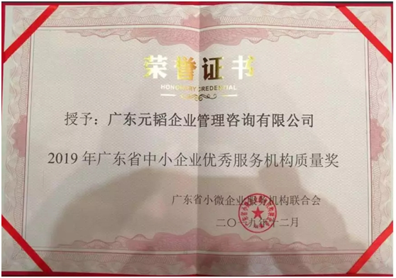 熱烈祝賀廣東元韜企業(yè)管理咨詢有限公司榮獲“2019年廣東省中小企業(yè)優(yōu)秀服務(wù)機構(gòu)質(zhì)量獎”