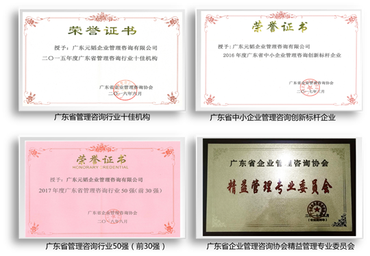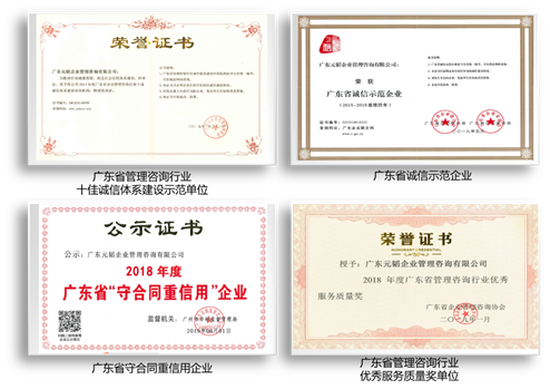 元韜公司自建立以來(lái),十分注重提升自身素質(zhì)和建立社會(huì)信譽(yù)。公司行業(yè)資質(zhì)過(guò)硬、質(zhì)量認(rèn)證體系健全,得到了社會(huì)、行業(yè)及企業(yè)的贊譽(yù)。公司2014年被評(píng)為“廣東省企業(yè)管理咨詢(xún)行業(yè)十佳誠(chéng)信體系建設(shè)示范單位”,2015年被評(píng)為“廣東省管理咨詢(xún)行業(yè)十佳機(jī)構(gòu)”,2016年被評(píng)為“廣東省中小企業(yè)管理咨詢(xún)創(chuàng)新標(biāo)桿企業(yè)”,2015-2018年連續(xù)四年被評(píng)為“廣東省管理咨詢(xún)行業(yè)50強(qiáng)(前30強(qiáng))”, 2016-2017年連續(xù)兩年被評(píng)為“廣東省中小企業(yè)優(yōu)秀服務(wù)機(jī)構(gòu)100佳”,2017年被評(píng)為“廣東省管理咨詢(xún)行業(yè)最具影響力單位”,2018年獲得“廣東省管理咨詢(xún)行業(yè)優(yōu)秀服務(wù)質(zhì)量獎(jiǎng)”,2015-2018年連續(xù)四年被評(píng)為“廣東省守合同重信用企業(yè)”,2015-2018年連續(xù)四年被評(píng)為“廣東省誠(chéng)信示范企業(yè)”。
