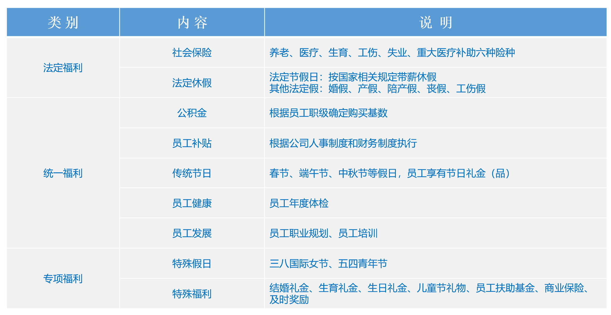 ? ? ? 為吸引和留住優(yōu)秀人才,同時(shí)增強(qiáng)員工的集體歸屬感,以及形成良好的企業(yè)向心力和凝聚力,公司為員工提供優(yōu)良的福利。