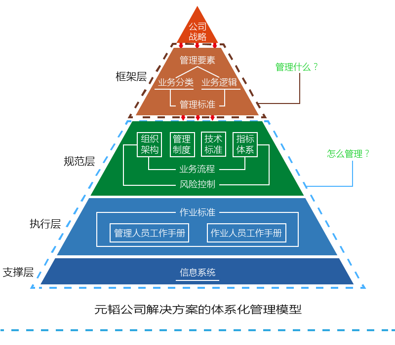 ? ? ? 以企業(yè)發(fā)展戰(zhàn)略為基礎(chǔ),通過對管理要素、業(yè)務(wù)分類、管理標(biāo)準(zhǔn)、管控策略等內(nèi)容進行系統(tǒng)梳理,搭建一體化的業(yè)務(wù)管理框架,理清企業(yè)業(yè)務(wù)管理管什么、怎么管、管成什么樣以及用什么形式/載體管等核心問題。